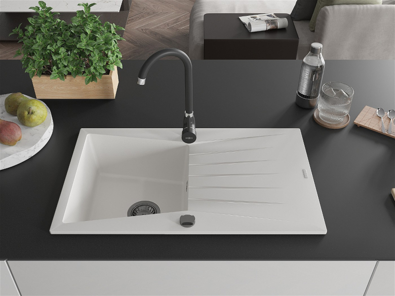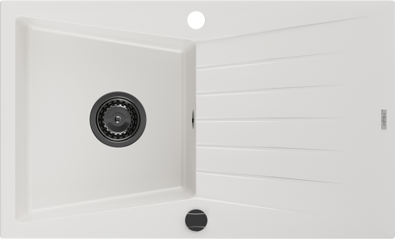 Mexen Cesar 1miskový granitový drez s odkvapkávačom 775 x 470 mm, biely, čierny sifón - 6514771010-20-B
