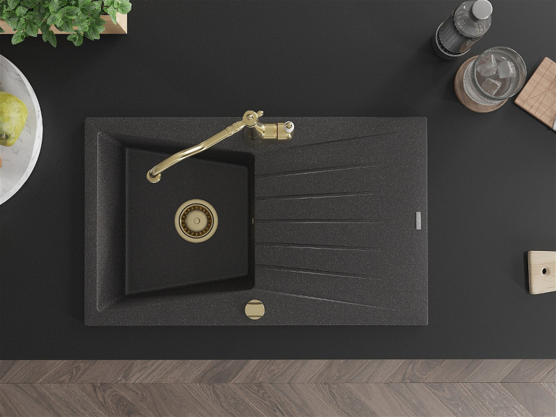 Mexen Cesar, 1miskový granitový drez s odkvapkávačom a kuchynskou batériou Carla, škvrnitá čierna - 6514-76-670700-50