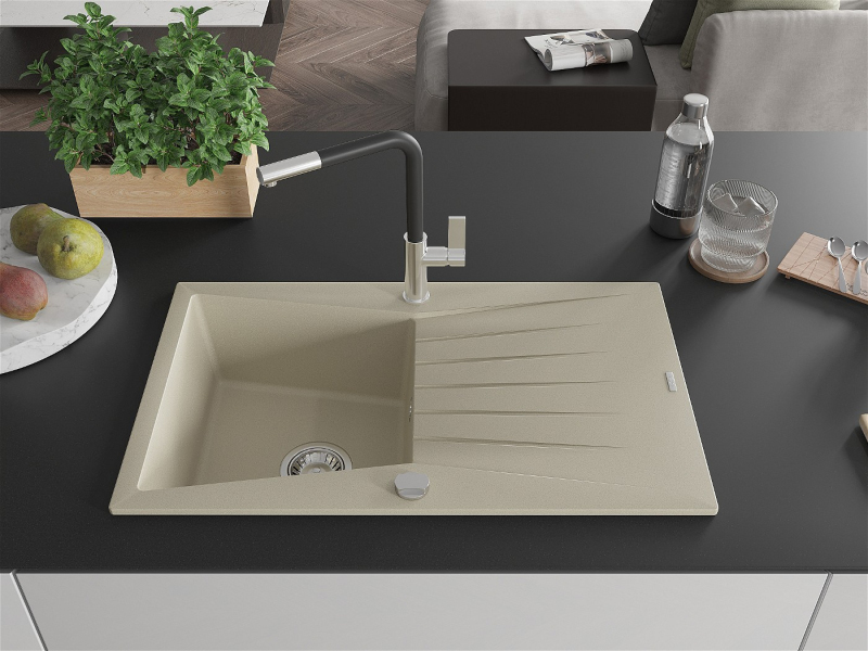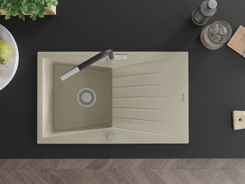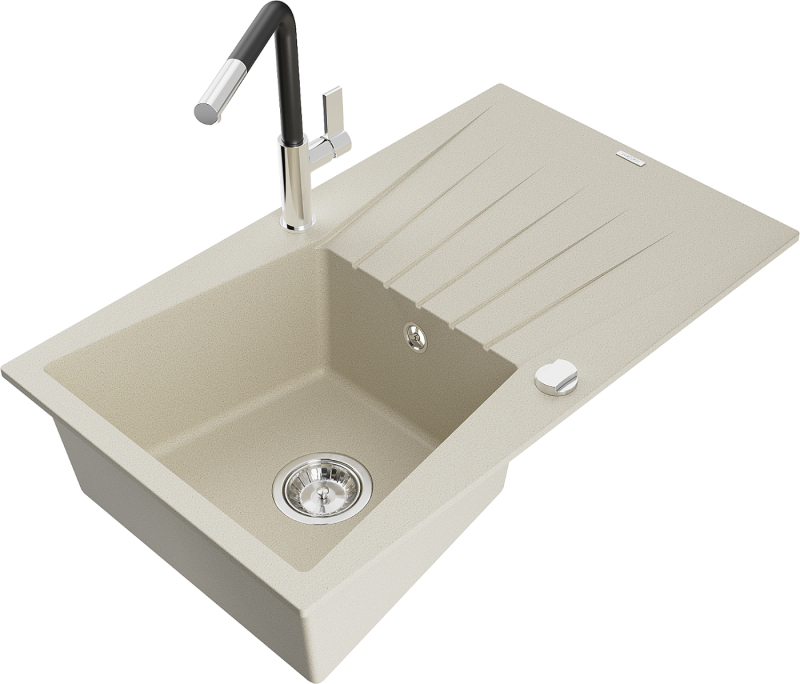 Mexen Cesar 1miskový granitový drez s odkvapkávačom a kuchynskou batériou Flora, béžová - 6514-69-670401-07