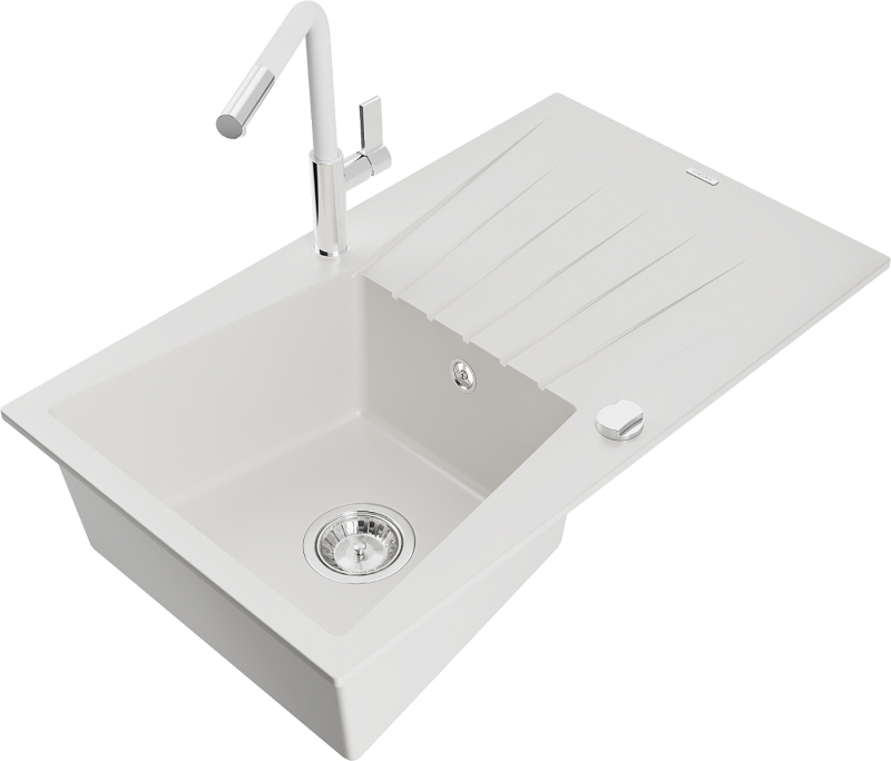 Mexen Cesar 1miskový granitový drez s odkvapkávačom a kuchynskou batériou Flora, biela - 6514-20-670401-02