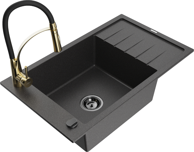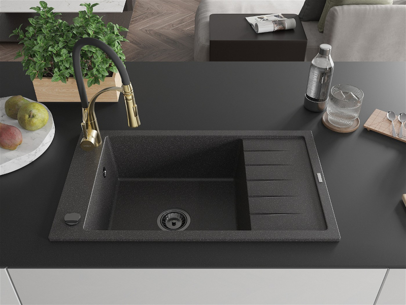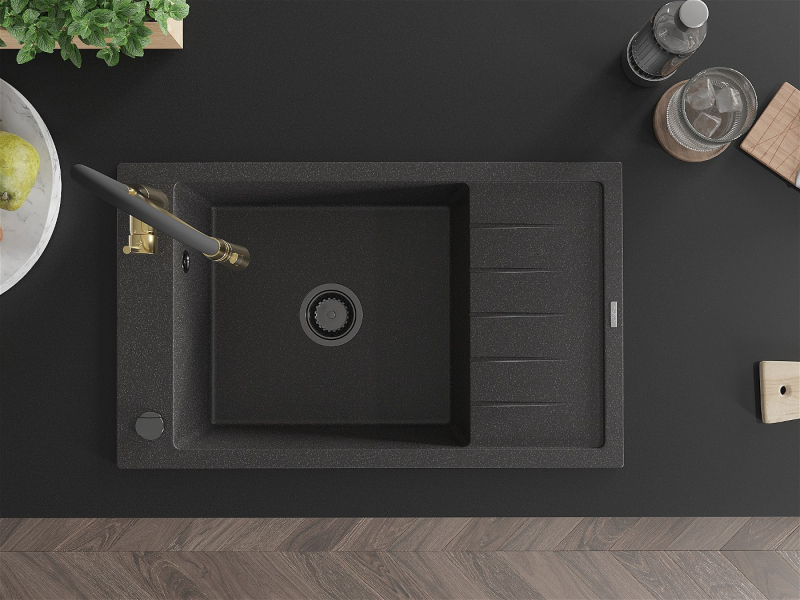 Mexen Elias 1-miskový granitový drez s odkvapkávačom a kuchynskou batériou Aster, škvrnitá čierna - 6511-76-73450-57-B