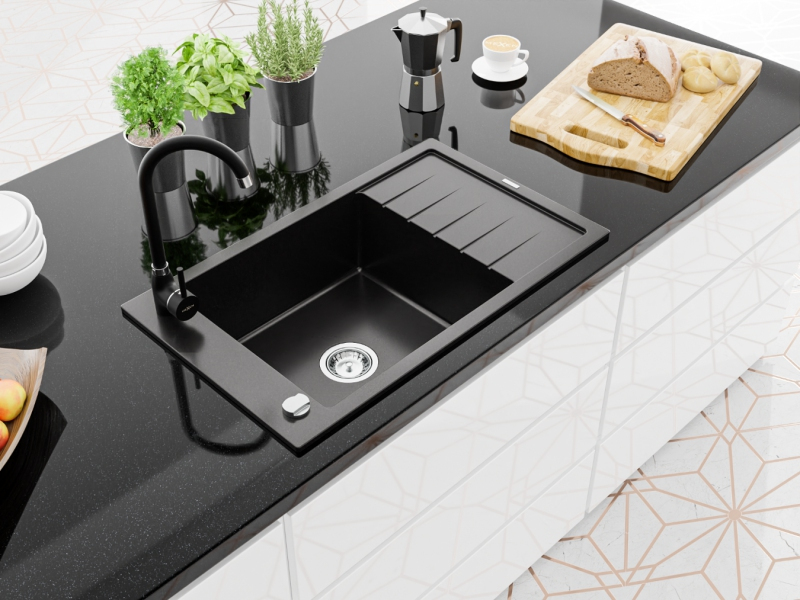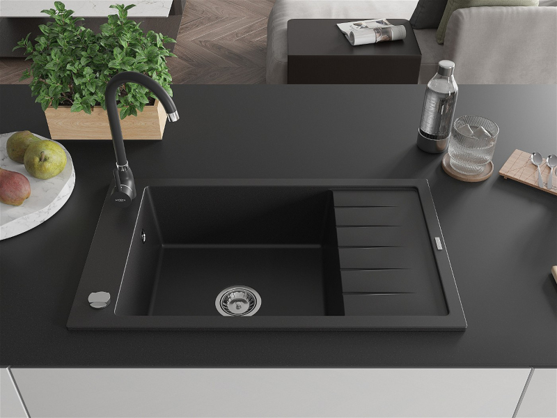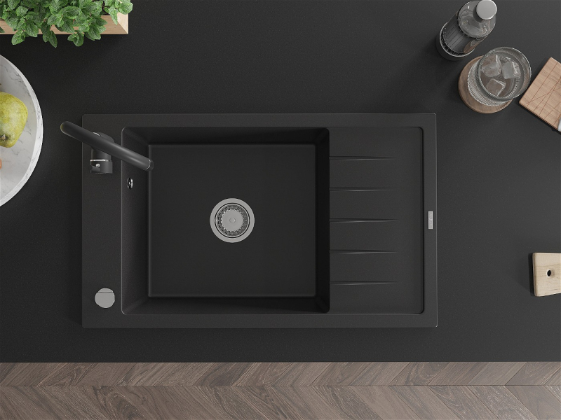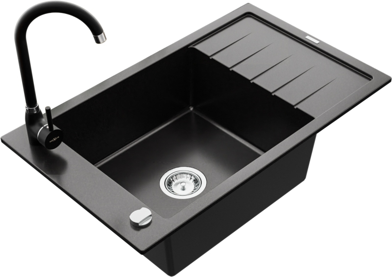 Mexen Elias 1miskový granit drez s odkvapom a batériou Telma, čierna 6511-77-670200-70