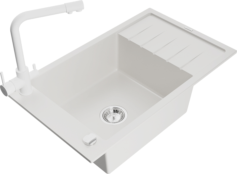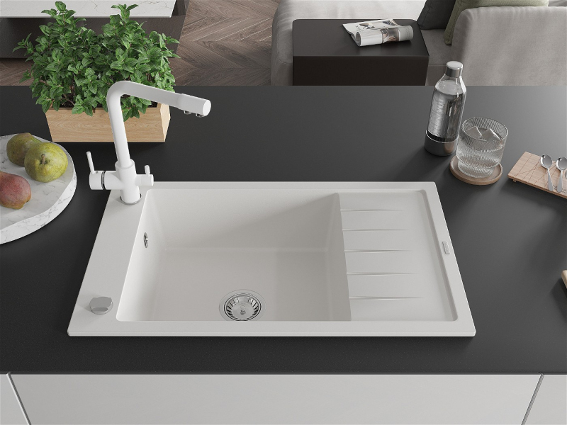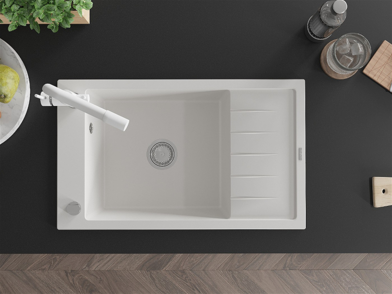 Mexen Elias 1miskový granitový drez s odkvapkávačom a kuchynskou batériou Duero, biela - 6511-20-671600-20