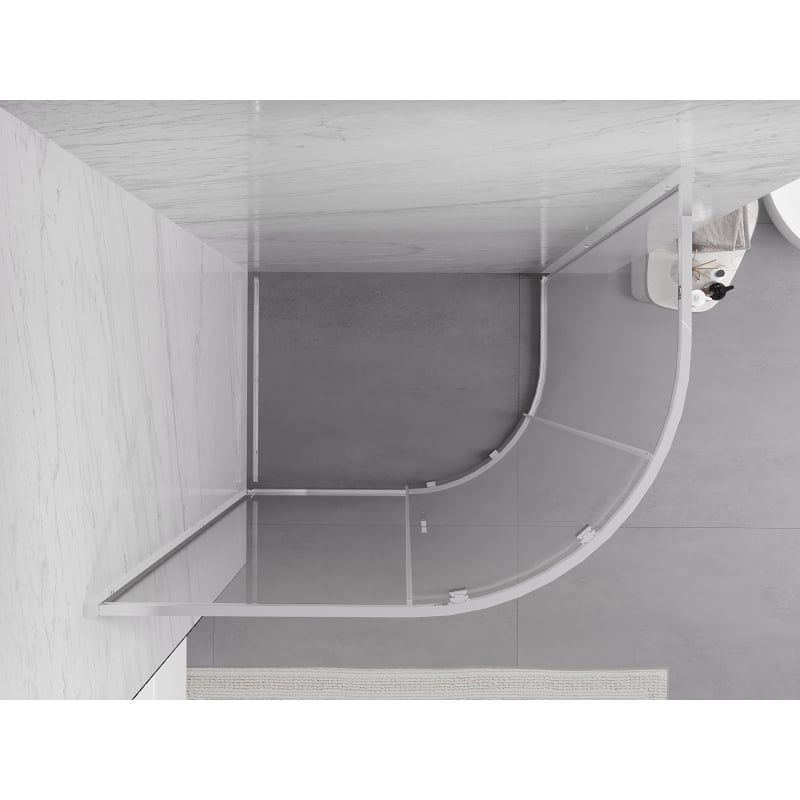 Špecifikácia produktu: Rozmer: 100x80 cm Výška: 200 cm Polomer zakrivenia R55 Montáž: Univerzálny Vstup: Posuvné dvere Farba skla: Priehľadná Povrchová úprava: Chróm Typ skla: Tvrdené Hrúbka skla: 6 mm Profil: Hliník Povlak pre ľahké čistenie obklady Kovová rukoväť Sada tesnení na odvod vody Hliníkový prah na tesnenie dverí