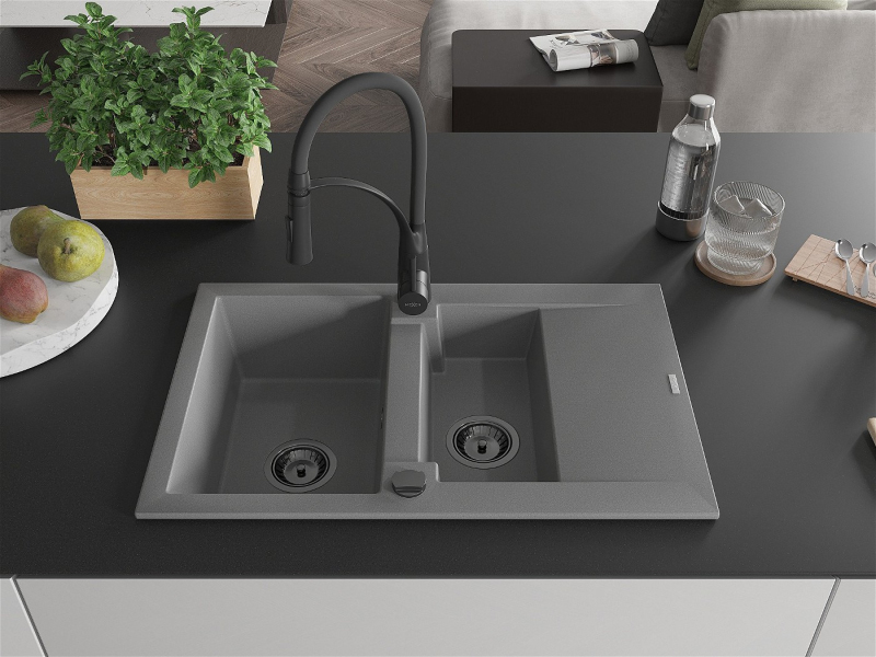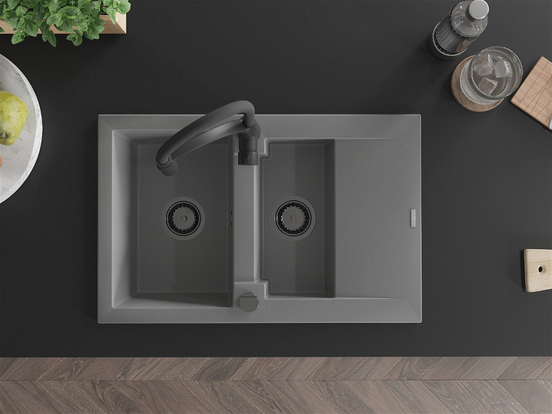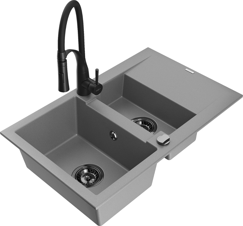 Mexen Gaspar 1,5-miskový granitový drez s odkvapkávačom a kuchynskou batériou Aster, sivá - 6507-71-73450-70-B