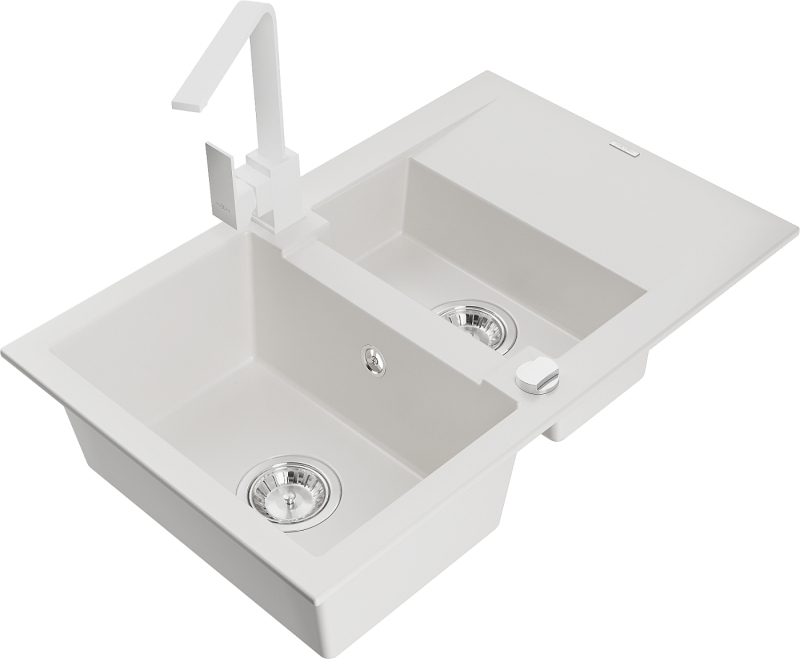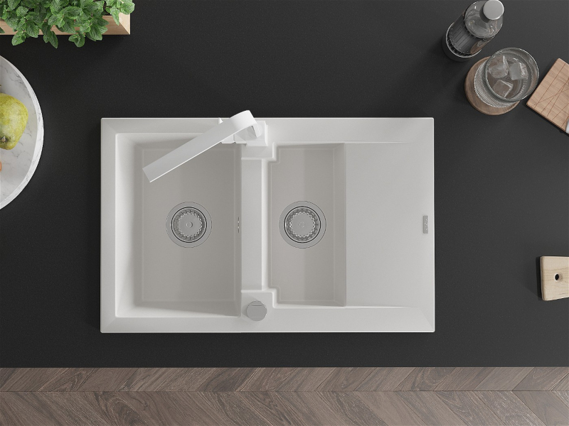 Mexen Gaspar 1,5-miskový granitový drez s odkvapkávačom a kuchynskou batériou Rita, biela - 6507-20-670300-20