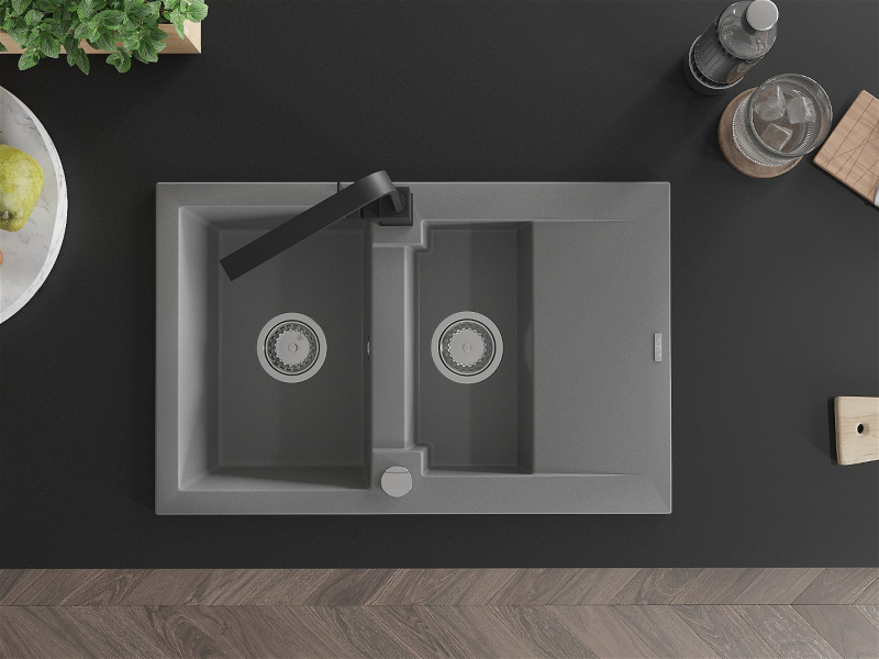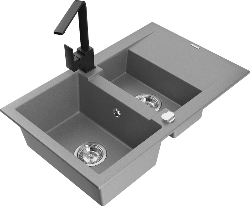 Mexen Gaspar 1,5-miskový granitový drez s odkvapkávačom a kuchynskou batériou Rita, šedá - 6507-71-670300-70