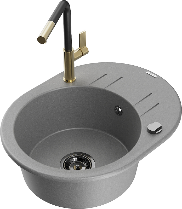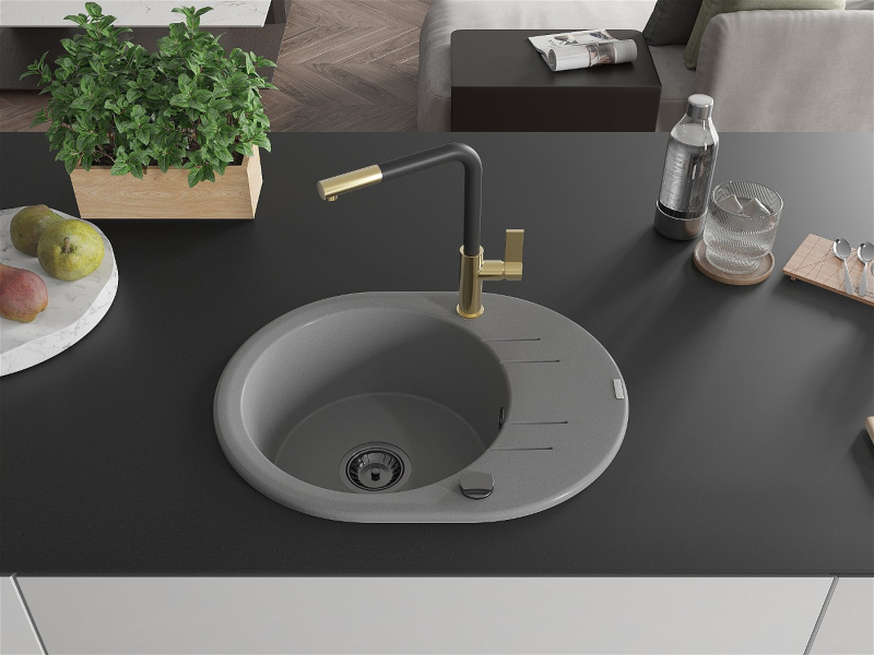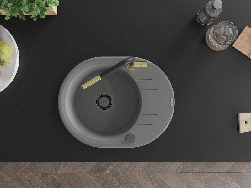 Mexen Kevin 1-miskový granitový drez s odkvapkávačom a kuchynskou batériou Flora, sivá - 6517-71-670401-57-B
