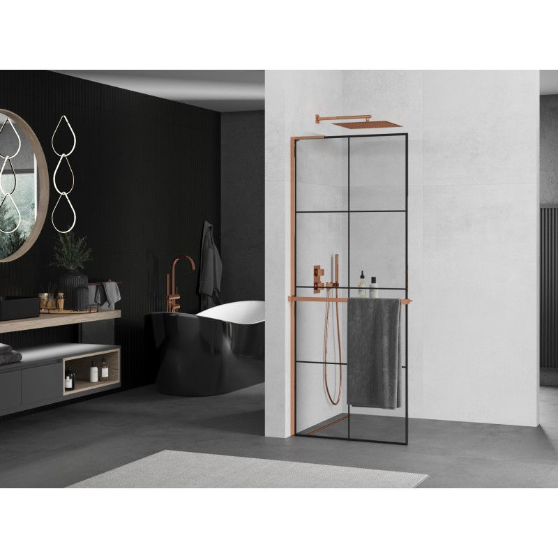 Špecifikácia produktu: Šírka: 70 cm Výška: 200 cm Montáž: Univerzálna, pravá alebo ľavá Farba skla: Čierna mriežka Povrchová úprava: Ružové zlato Typ skla: Tvrdené Hrúbka skla: 8 mm Profil: Hliník Uhlový stabilizátor v tvare L: Nerezová oceľ Materiál police 3,2 cm Max. dĺžka police: 140 cm Možnosť skrátenia police Povlak na jednoduché čistenie Vyrovnanie nerovností steny Možnosť inštalácie na sprchovú vaničku alebo obklady