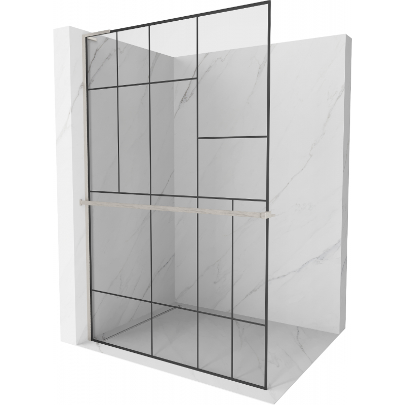 Špecifikácia produktu: Šírka: 80 cm Výška: 200 cm Montáž: Univerzálna, pravá alebo ľavá Farba skla: Čierny vzor Povrchová úprava: Kartáčovaný nikel Typ skla: Tvrdené Hrúbka skla: 8 mm Profil: Hliník Uhlový stabilizátor v tvare L: Nerezová oceľ Materiál police: Hli cm Max. dĺžka police: 140 cm Možnosť skrátenia police Povlak na jednoduché čistenie Vyrovnanie nerovností steny Možnosť inštalácie na sprchovú vaničku alebo obklady