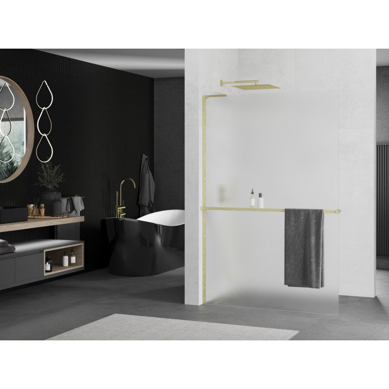 Špecifikácia produktu: Šírka: 100 cm Výška: 200 cm Montáž: Univerzálna, pravá alebo ľavá Farba skla: Mliečna Povrchová úprava: Kartáčované zlato Typ skla: Tvrdené Hrúbka skla: 8 mm Profil: Hliník Uhlový stabilizátor v tvare L: Nerezová oceľ Materiál police: Hliník Max. dĺžka police: 140 cm Možnosť skrátenia police Povlak na jednoduché čistenie Vyrovnanie nerovností steny Možnosť inštalácie na sprchovú vaničku alebo obklady