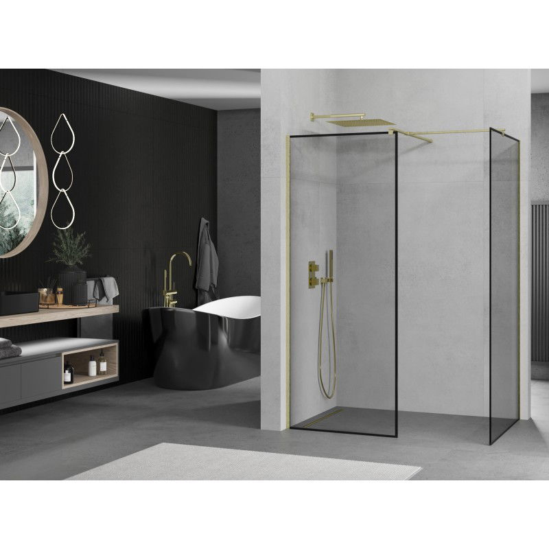 Špecifikácia produktu: Šírka: 130x120 cm (stena X - 130 cm, stena Y - 120 cm) Výška: 200 cm Montáž: Univerzálna Farba skla: Čierny rám Povrchová úprava: Kartáčované zlato Typ skla: Tvrdené Hrúbka skla: 8 mm Profil: Hliník Konzol. dĺžka konzoly: 150 cm Konzolu je možné skrátiť Povrchová úprava pre ľahké čistenie Vyrovnanie nerovností steny Možnosť inštalácie na sprchovú vaničku alebo obklady