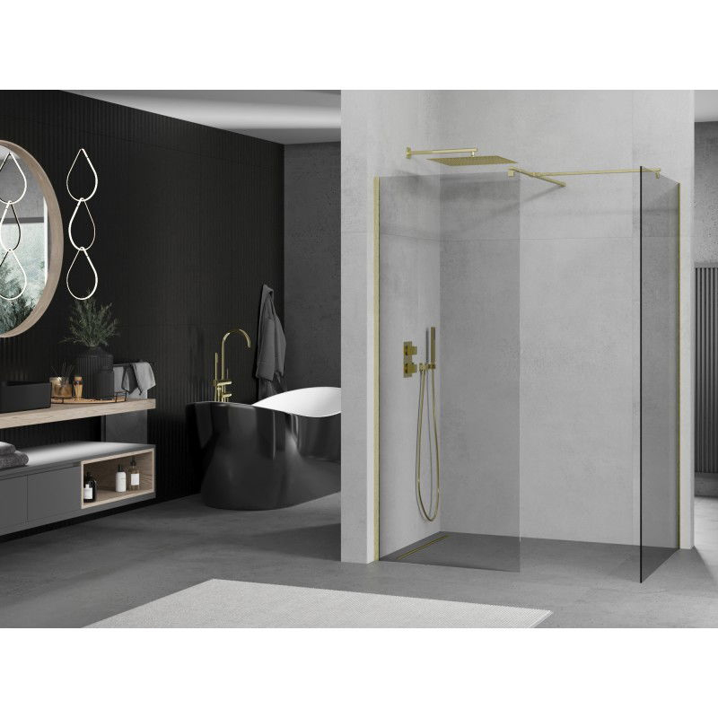 Špecifikácia produktu: Šírka: 130x95 cm (stena X - 130 cm, stena Y - 95 cm) Výška: 200 cm Montáž: Univerzálna Farba skla: Priehľadná Povrchová úprava: Kartáčované zlato Typ skla: Tvrdené Hrúbka skla: 8 mm Profil: Hliník Konzola dĺžka konzoly: 150 cm Konzolu je možné skrátiť Povrchová úprava pre ľahké čistenie Vyrovnanie nerovností steny Možnosť inštalácie na sprchovú vaničku alebo obklady