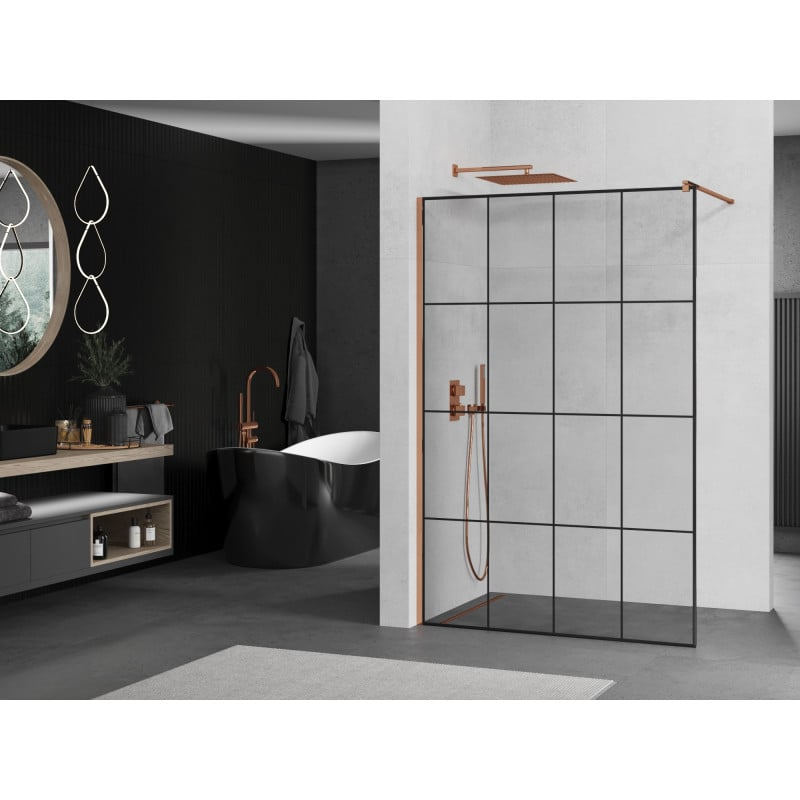 Špecifikácia produktu: Šírka: 140 cm Výška: 200 cm Montáž: Univerzálna, pravá alebo ľavá Farba skla: Čierna mriežka Povrchová úprava: Ružové zlato Typ skla: Tvrdené Hrúbka skla: 8 mm Profil: Hliník Konzola: Nerezová oceľ Max. dĺžka konzoly: 150 cm Konzolu je možné skrátiť Povrchová úprava pre ľahké čistenie Vyrovnáva nerovnosti steny Možno namontovať na sprchovú vaničku alebo dlaždice