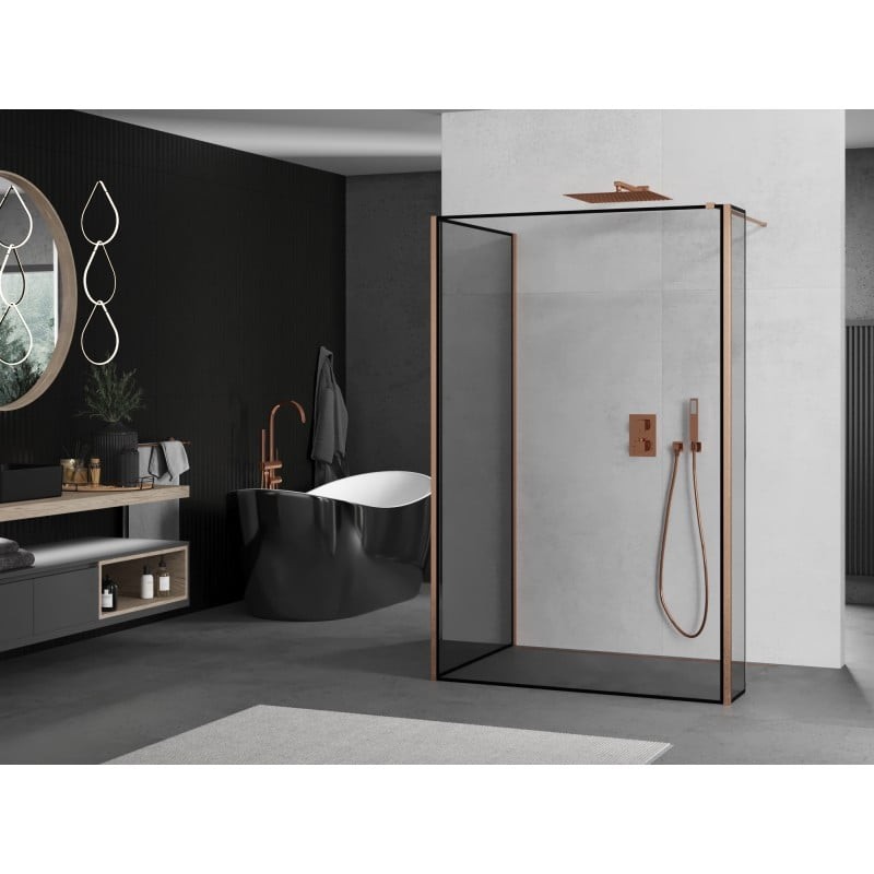 Špecifikácia produktu: Šírka: 140x90x40 cm (stena X - 140 cm, stena Y - 90 cm, stena Z - 40 cm) Výška: 200 cm Montáž: Univerzálna Farba skla: Čierny rám Povrchová úprava: Kartáčovaná meď Typ skla: Tvrdené Hrúbka skla: Tvrdené Hrúbka skla: dĺžka konzoly: 150 cm Konzolu je možné skrátiť Povrchová úprava pre ľahké čistenie Vyrovnanie nerovností steny Možnosť inštalácie na sprchovú vaničku alebo obklady