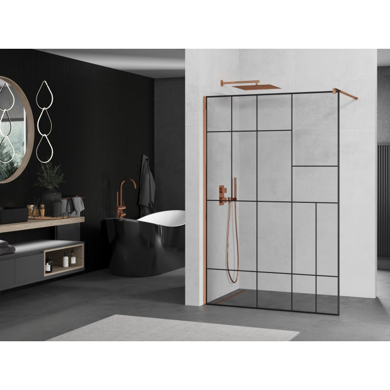 Špecifikácia produktu: Šírka: 90 cm Výška: 200 cm Montáž: Univerzálna, pravá alebo ľavá Farba skla: Čierny vzor Povrchová úprava: Ružové zlato Typ skla: Tvrdené Hrúbka skla: 8 mm Profil: Hliník Konzola: Nerezová oceľ Max. dĺžka konzoly: 150 cm Konzolu je možné skrátiť Povrchová úprava pre ľahké čistenie Vyrovnáva nerovnosti steny Možnosť montáže na sprchovú vaničku alebo dlaždice