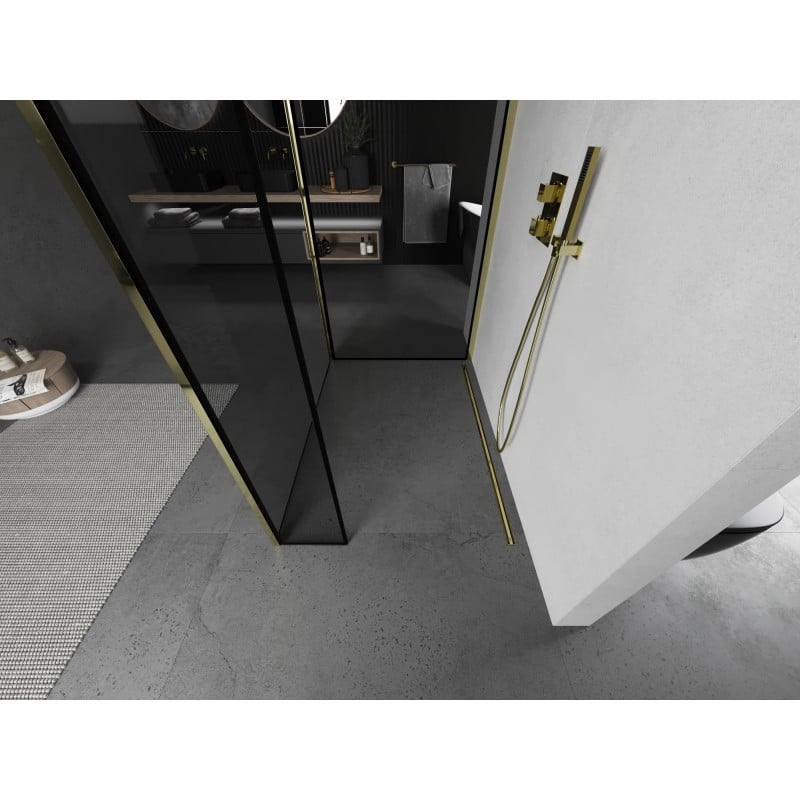 Špecifikácia produktu: Šírka: 90x80x40 cm (stena X - 90 cm, stena Y - 80 cm, stena Z - 40 cm) Výška: 200 cm Montáž: Univerzálna Farba skla: Čierny rám Povrchová úprava: Zlatá Typ skla: Tvrdené Hrúbka skla: 8 mm dĺžka konzoly: 150 cm Konzolu je možné skrátiť Povrchová úprava pre ľahké čistenie Vyrovnanie nerovností steny Možnosť inštalácie na sprchovú vaničku alebo obklady