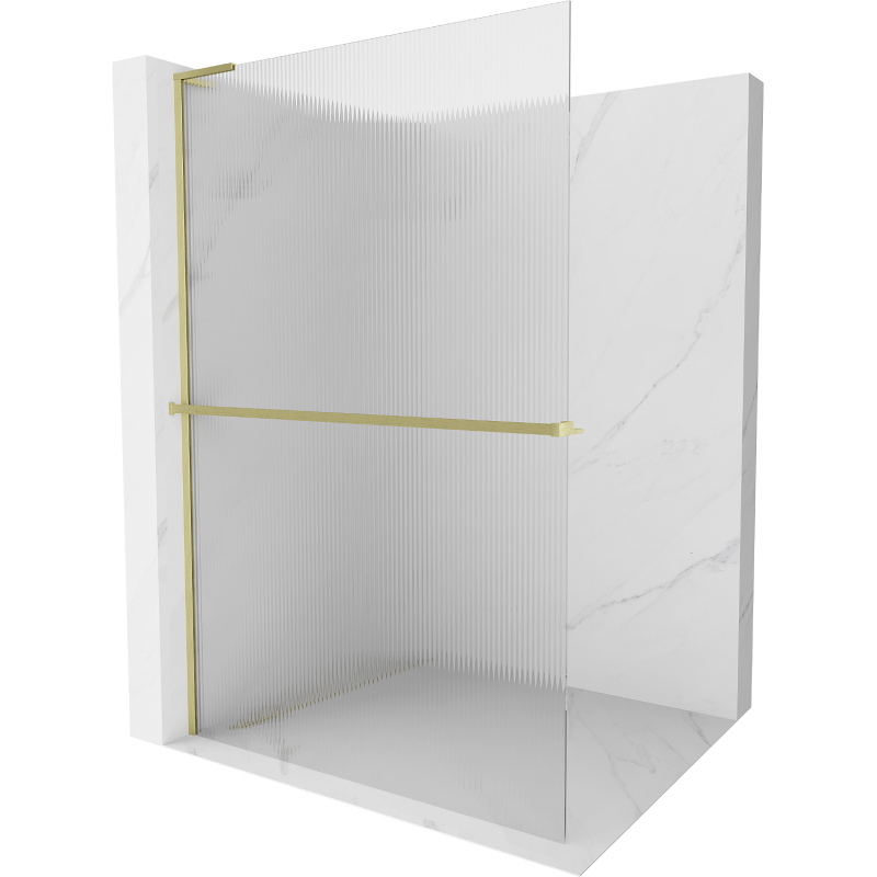 Špecifikácia produktu: Šírka: 110 cm Výška: 200 cm Montáž: Univerzálna, pravá alebo ľavá Farba skla: Pruhované Povrchová úprava: Kartáčované zlato Typ skla: Tvrdené Hrúbka skla: 8 mm Profil: Hliník Uhlový stabilizátor v tvare L: Nerezová oceľ Materiál police: Hli cm Max. dĺžka police: 140 cm Možnosť skrátenia police Povlak na jednoduché čistenie Vyrovnanie nerovností steny Možnosť inštalácie na sprchovú vaničku alebo obklady