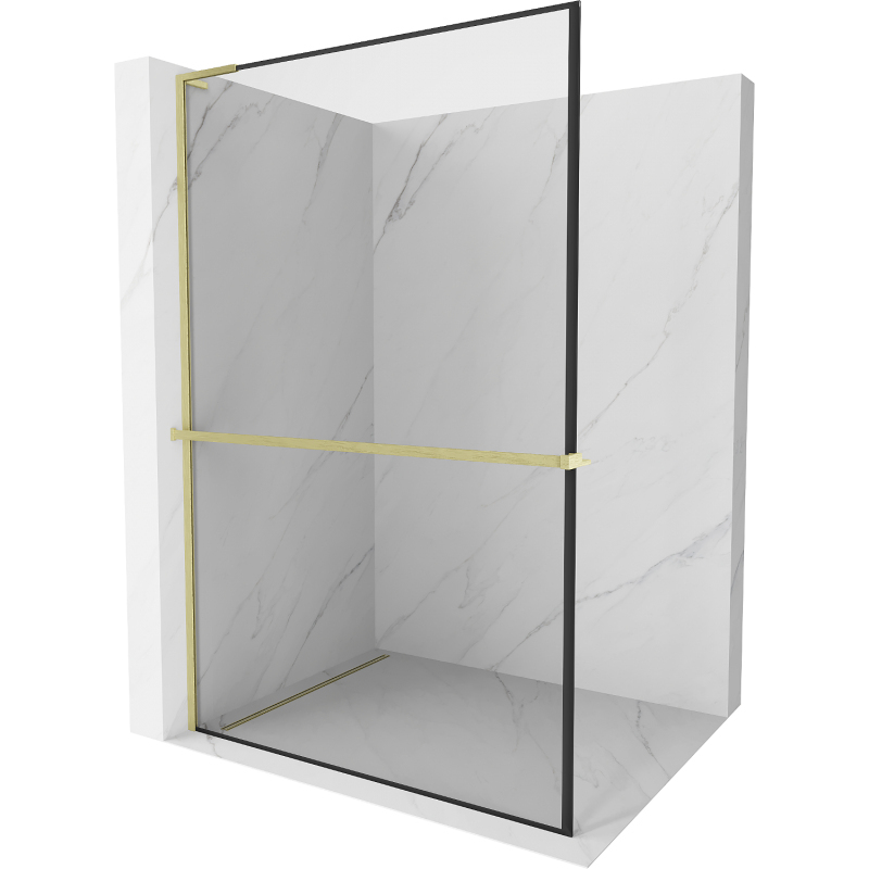 Špecifikácia produktu: Šírka: 60 cm Výška: 200 cm Montáž: Univerzálna, pravá alebo ľavá Farba skla: Čierny rám Povrchová úprava: Kartáčované zlato Typ skla: Tvrdené Hrúbka skla: 8 mm Profil: Hliník Uhlový stabilizátor v tvare L: Nehrdzavejúca oceľ Materiál police: Hliník Š2 Max. dĺžka police: 140 cm Možnosť skrátenia police Povlak na jednoduché čistenie Vyrovnanie nerovností steny Možnosť inštalácie na sprchovú vaničku alebo obklady