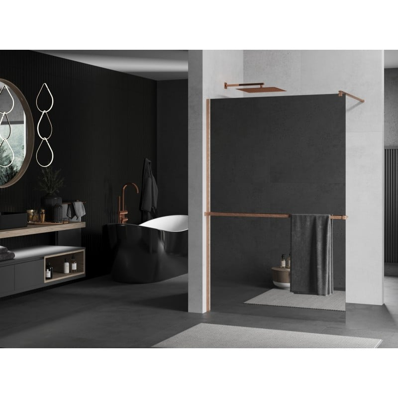 Špecifikácia produktu: Šírka: 90 cm Výška: 200 cm Montáž: Univerzálna, pravá alebo ľavá Farba skla: Zrkadlová Povrchová úprava: Kartáčovaná meď Typ skla: Tvrdené Hrúbka skla: 8 mm Profil: Hliník Konzola: Nerezová oceľ Max. dĺžka konzoly: 150 cm Materiál police: Hliník Šírka: 12,9 cm Výška: 3,2 cm Max. dĺžka police: 140 cm Konzolu a poličku je možné orezať Povrchová úprava pre ľahké čistenie Vyrovnáva nerovnosti steny Možno namontovať na sprchovú vaničku alebo dlaždice