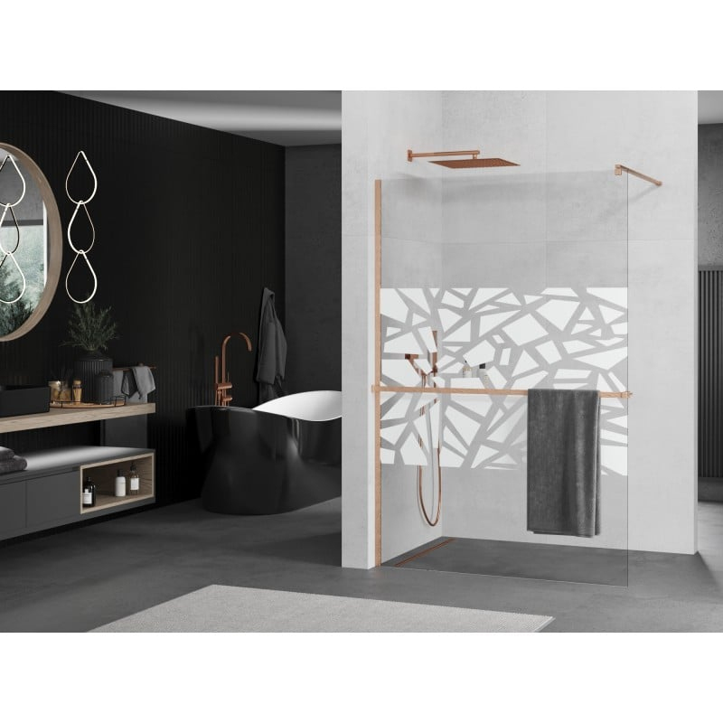 Špecifikácia produktu: Šírka: 100 cm Výška: 200 cm Montáž: Univerzálna, pravá alebo ľavá Farba skla: Biely vzor Povrchová úprava: Kartáčovaná meď Typ skla: Tvrdené Hrúbka skla: 8 mm Profil: Hliník Konzola: Nerezová oceľ Max. dĺžka konzoly: 150 cm Materiál police: Hliník Šírka: 12,9 cm Výška: 3,2 cm Max. dĺžka police: 140 cm Možnosť skrátenia konzoly a police Povlak na jednoduché čistenie Vyrovnanie nerovností stien Možnosť montáže na sprchovú vaničku alebo obklady