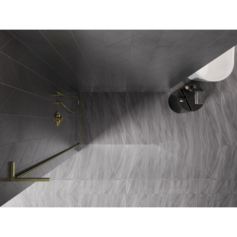 Špecifikácia produktu: Šírka: 80 cm Výška: 200 cm Montáž: Univerzálna, pravá alebo ľavá Farba skla: Priehľadná Povrchová úprava: Kartáčované zlato Typ skla: Tvrdené Hrúbka skla: 10 mm Profil: Hliník Uhlový stabilizátor v tvare L: Nerezová oceľ Povlak pre sprch