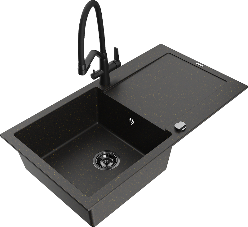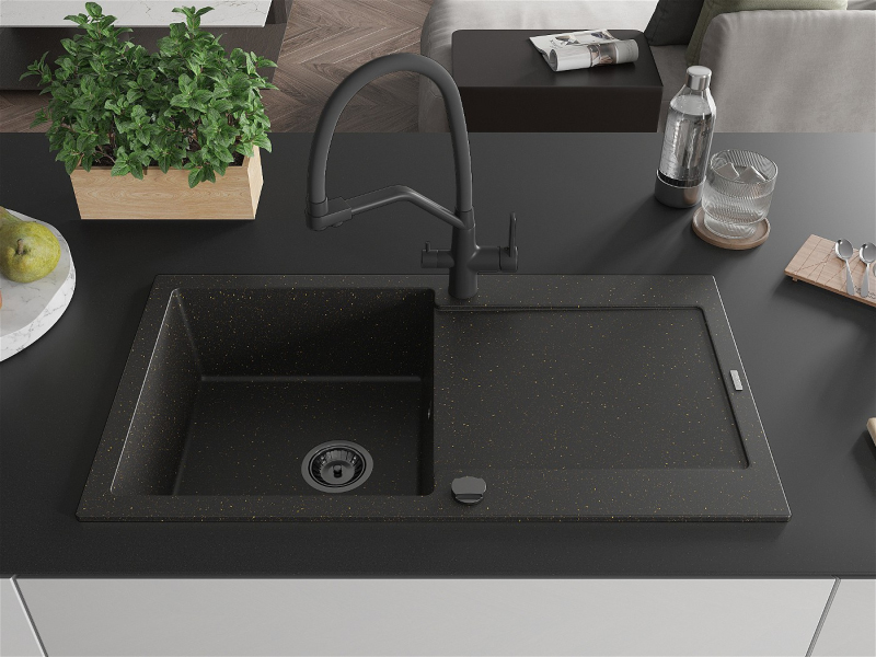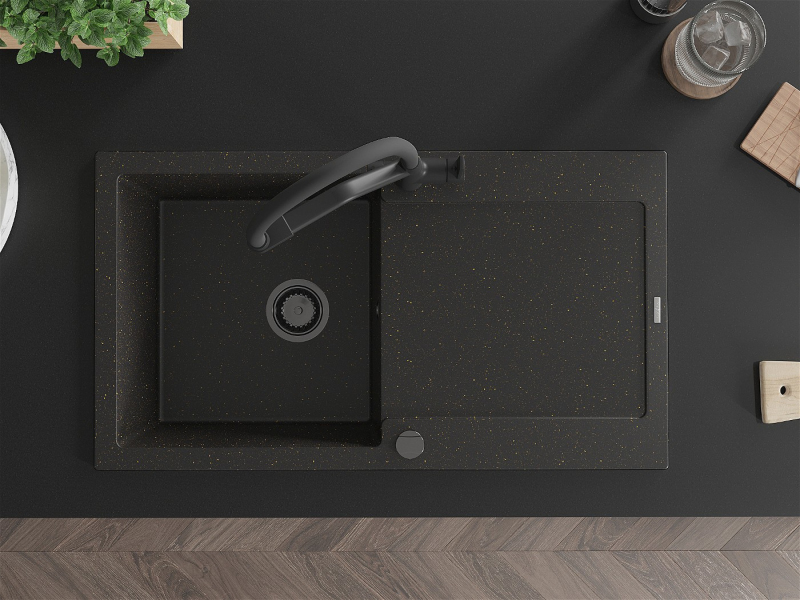Mexen Leo 1-miskový granitový drez s odkvapkávačom a kuchynskou batériou Duo, čierna/zlatá metalíza - 6501-75-671701-70-B