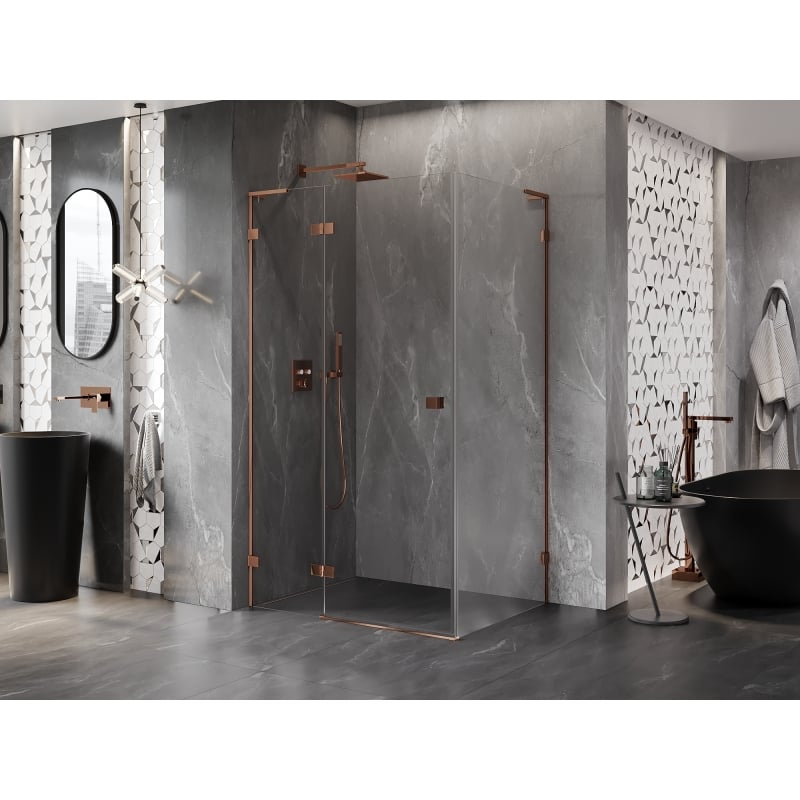 Špecifikácia produktu: Rozmer: 75x80 cm (ľavé dvere 75 cm, stena 80 cm) Výška: 200 cm Strana montáže: Ľavá Vchod: Dvere s otočnými pántami Farba skla: Priehľadná Povrchová úprava: Ružové zlato Profil: Hliník Stabilizátor v tvare L: Nerezová oceľ Typ skla: úprava pre ľahké čistenie Nastaviteľná šírka Dva montážne systémy: - s profilom, ktorý umožňuje vyrovnanie nerovností stien - bez profilu pre dokonale rovné steny Možnosť montáže na sprchovú vaničku alebo obklady Mechanizmus na zdvíhanie a spúšťanie dverí Mosadzné svorky a pánty v jednej rovine so sklom Magnetický prúžok a prástohové tesnenia
