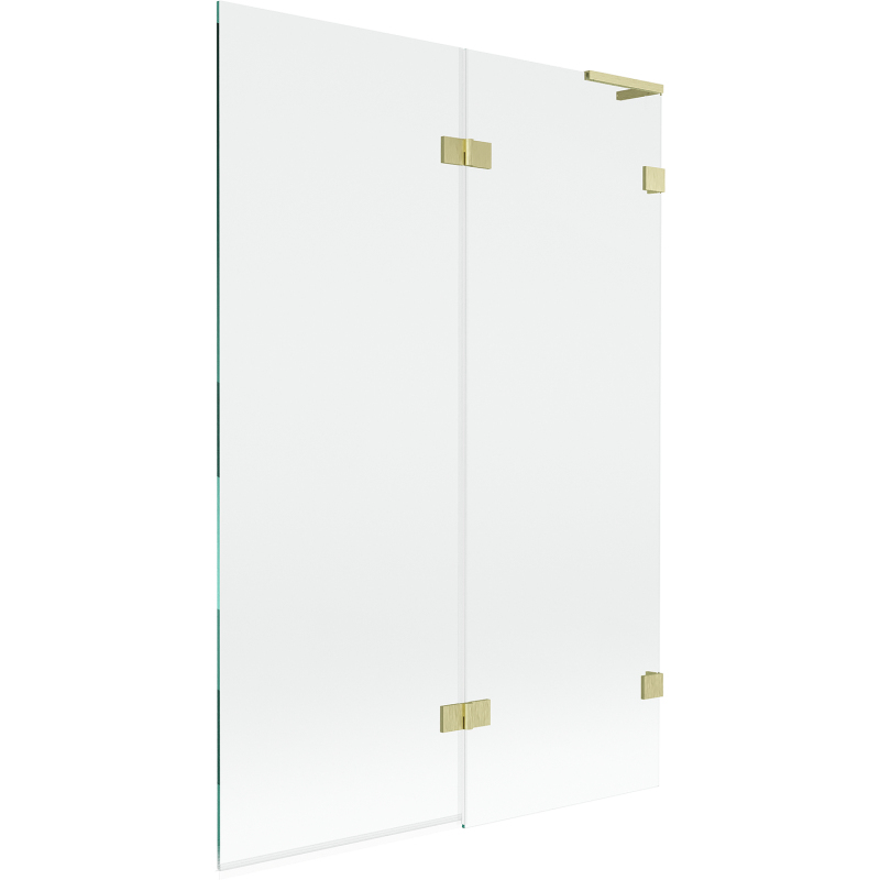 Špecifikácia produktu: Šírka: 120 cm Výška: 150 cm Typ: 2krídlové Strana montáže: Pravá Typ: Pohyblivé/Výklopné Typ skla: Tvrdené Farba skla: Priehľadná Hrúbka skla: 8 mm Povrchová úprava: Kartáčované zlato Stabilizátor uhla L: Nerezová svorky a pánty v jednej rovine so sklom Elastomérové tesnenia pre odvod vody Dva montážne systémy: - s profilom, ktorý umožňuje vyrovnanie nerovností steny - bez profilu pre dokonale rovné steny