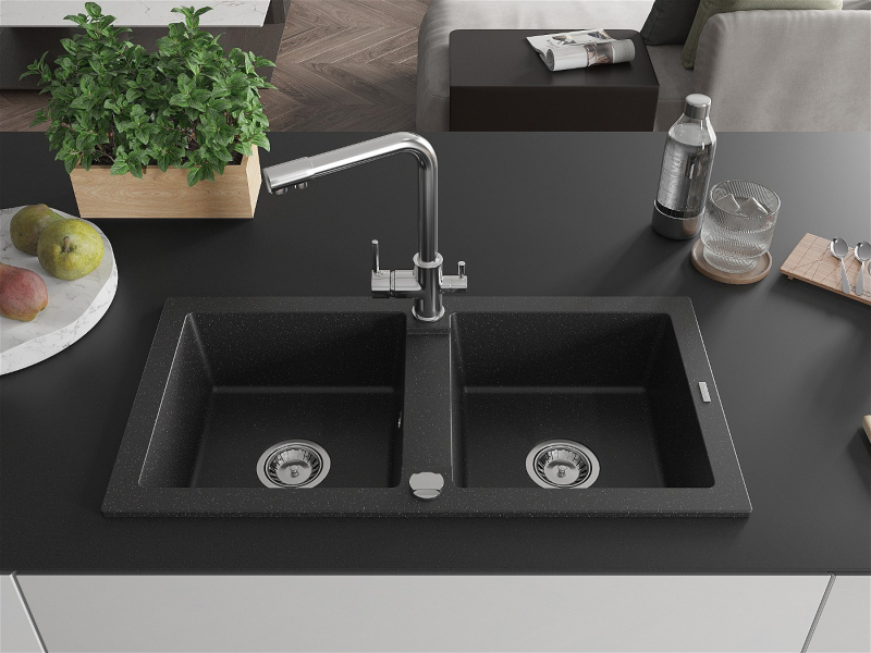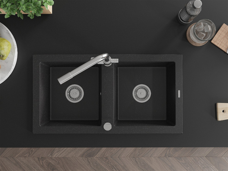 Mexen Mario 2-miskový granitový drez s kuchynskou batériou Duero, čierna/strieborná metalíza - 6504-73-671600-00