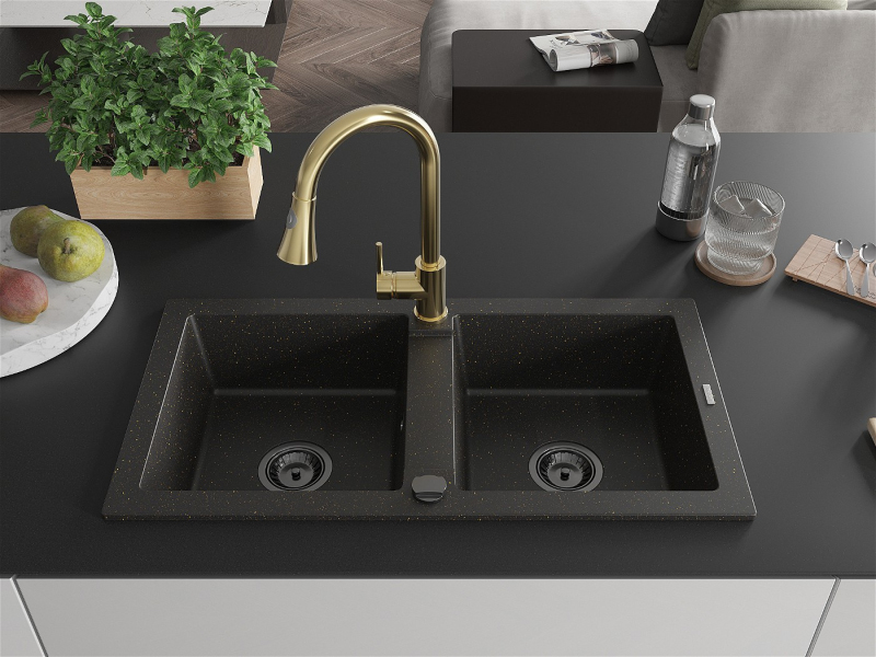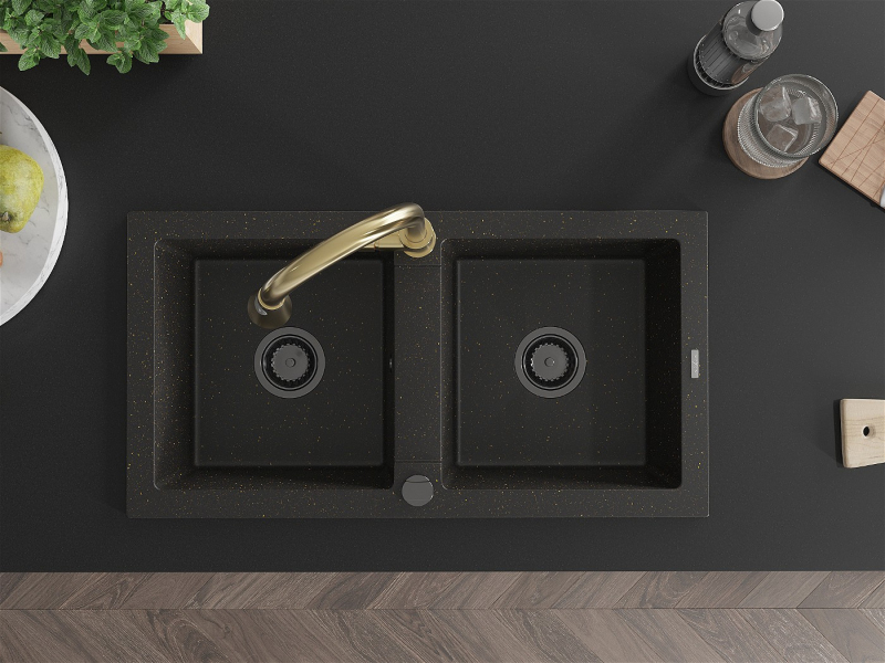 Mexen Mario 2-miskový granitový drez s kuchynskou batériou Elia, čierna/zlatá metalíza - 6504-75-670101-50-B