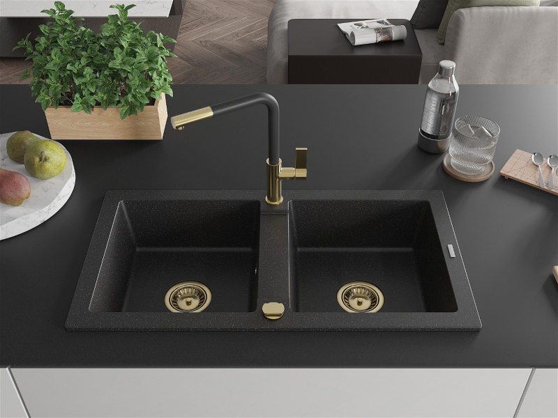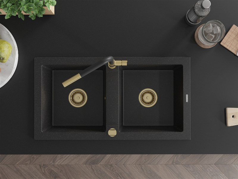 Mexen Mario 2-miskový granitový drez s kuchynskou batériou Flora, čierna/strieborná metalíza - 6504-73-670401-57-G