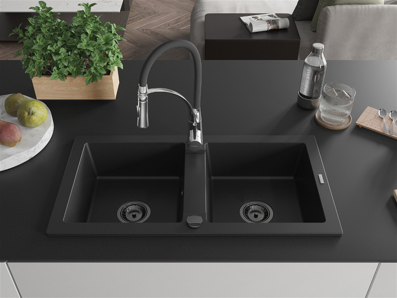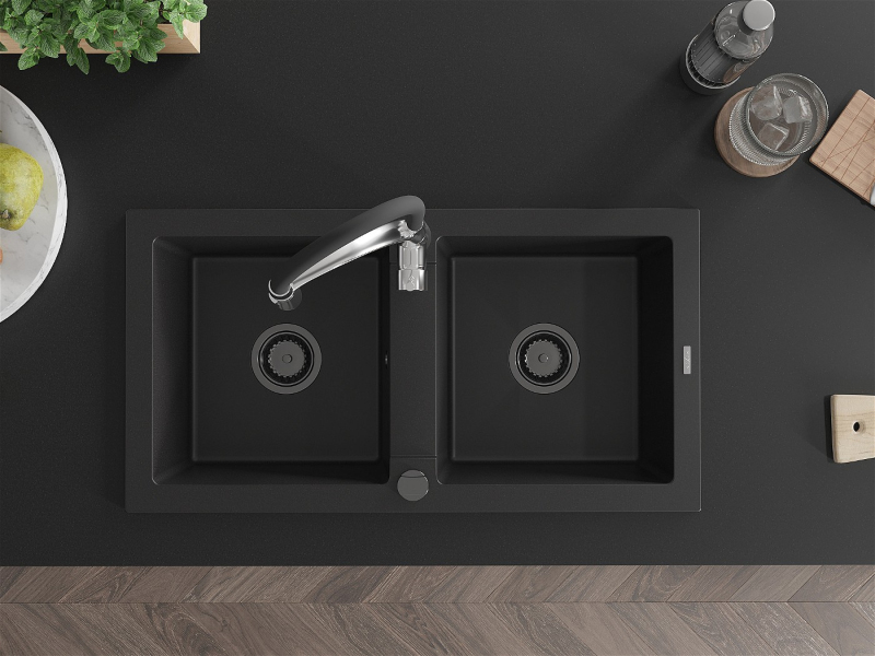 Mexen Mario 2miskový granitový drez s kuchynskou batériou Aster, čierna - 6504-77-73450-07-B