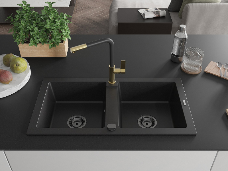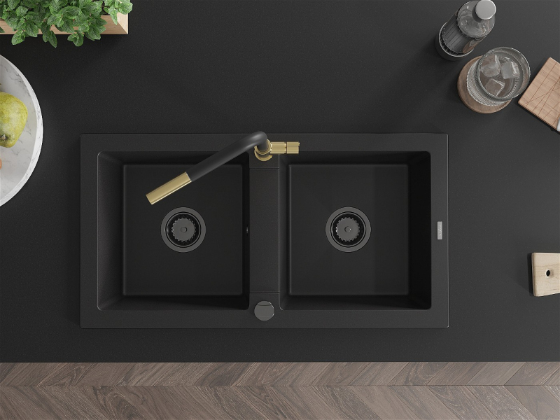 Mexen Mario 2miskový granitový drez s kuchynskou batériou Flora, čierna - 6504-77-670401-57-B