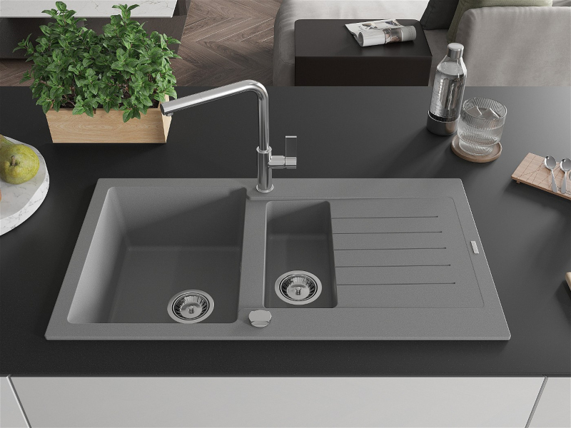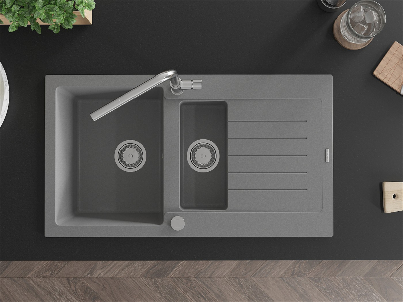 Mexen Matias 1,5-miskový granitový drez s odkvapkávačom a kuchynskou batériou Flora, sivá - 6502-71-670401-00