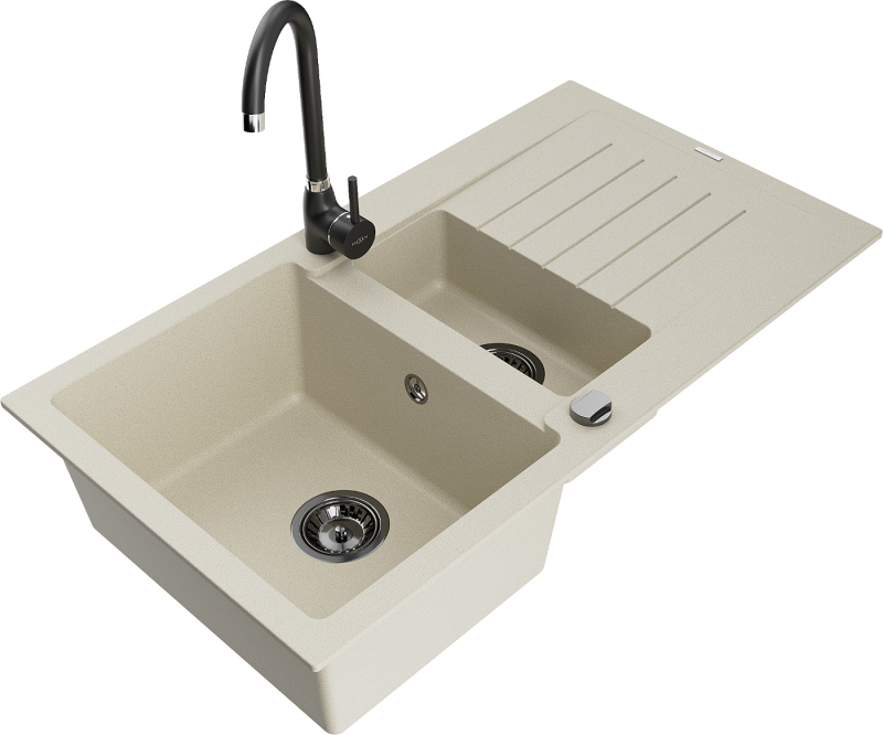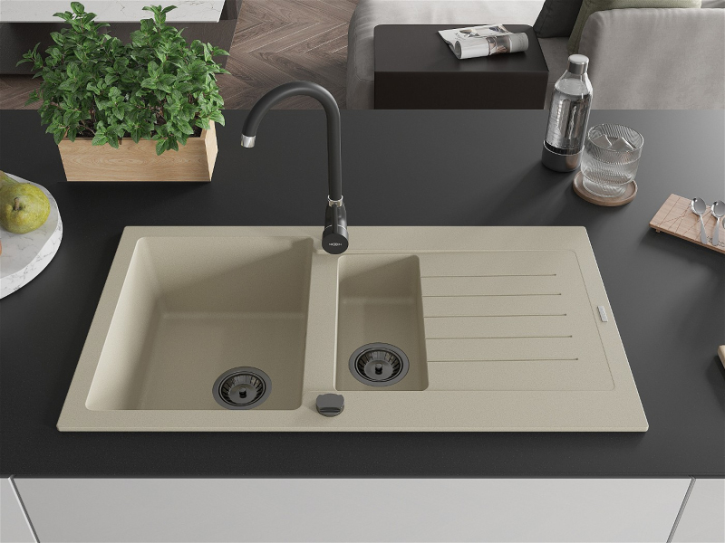 Mexen Matias 1,5-miskový granitový drez s odkvapkávačom a kuchynskou batériou Telma, béžová - 6502-69-670200-70