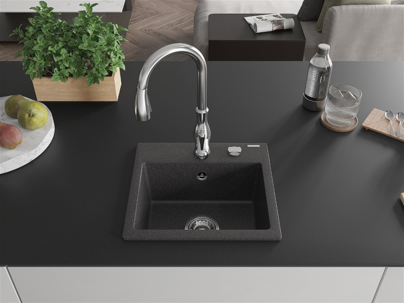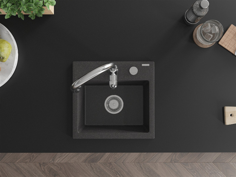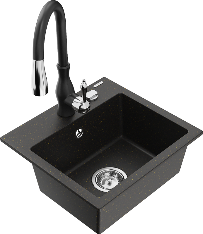 Mexen Milo 1miskový granitový drez s kuchynskou batériou Savita, čierna/zlatá metalíza - 6505-75-672601-70