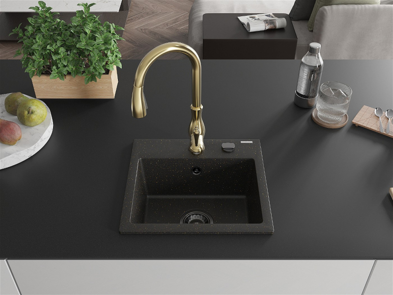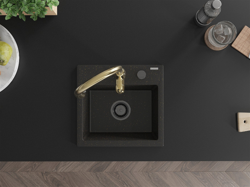 Mexen Milo granitový drez s 1 misou s kuchynskou batériou Savita, čierna/zlatá metalíza - 6505-75-672601-50-B