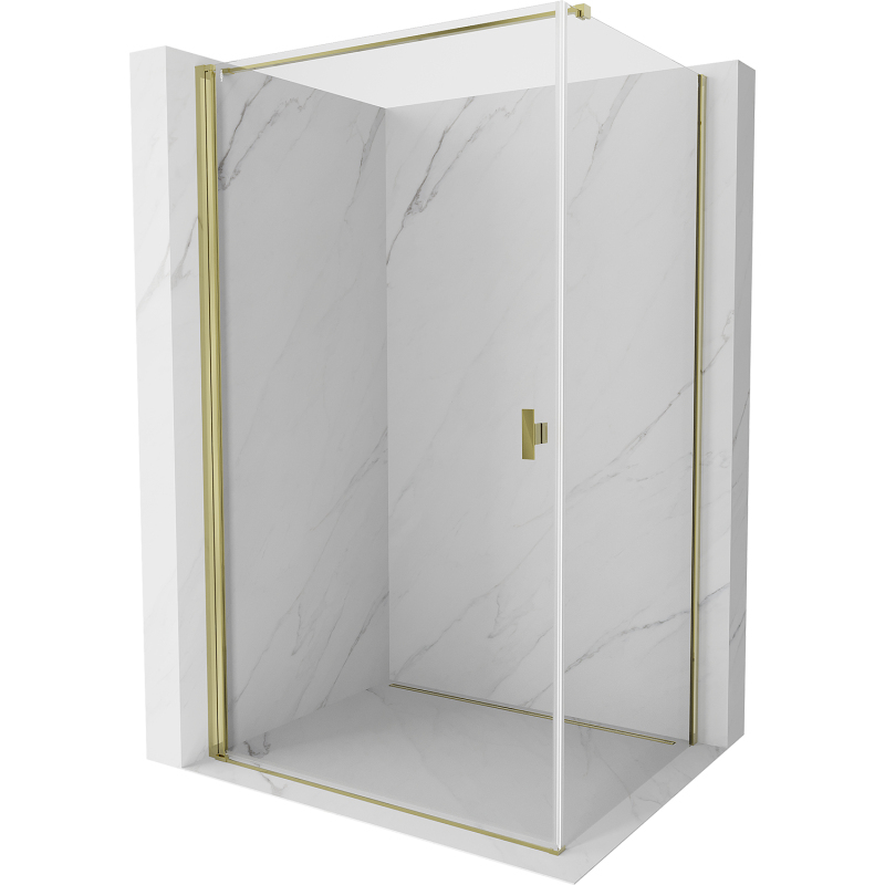 Špecifikácia produktu: Rozmer: 85x110 cm (dvere 85 cm, stena 110 cm) Výška: 200 cm Strana montáže: Univerzálny Vchod: Dvere s otočnými pántami Farba skla: Priehľadná Povrchová úprava: Zlatá Profil: Hliník Konzola: Nerezová oceľ Max. dĺžka konzoly: 150 cm Konzolu možno rezať Typ skla: Tvrdené Hrúbka skla: 6 mm Povrchová úprava pre ľahké čistenie Nastaviteľná šírka Možnosť montáže na sprchovú vaničku alebo dlaždice Mechanizmus zdvíhania a spúšťania dverí Magnetický prúžok a elastomérové tesnenie pre odtok