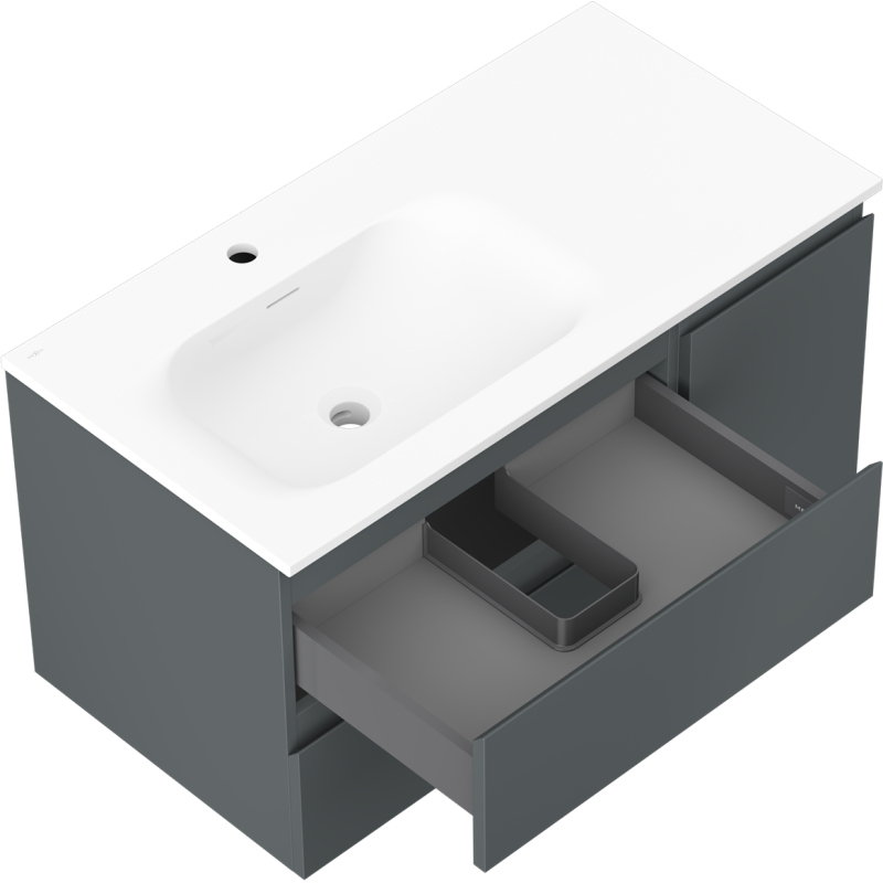 Špecifikácia produktu: Rozmery skrinky: Šírka: 90 cm Hĺbka: 46 cm Výška: 47 cm Sada obsahuje: Zásuvková skrinka pod umývadlo: Šírka: 60 cm Hĺbka: 46 cm Výška: 47 cm Farba korpusu: Matný grafit Materiál korpusu čela: Lakovaná MDF doska Štruktúra čela: Hladká Počet zásuviek: 2 Priestranná zásuvka s funkciou tlmeného dovierania Umývadlová skrinka s dvierkami: Šírka: 30 cm Výška: 47 cm Hĺbka: 46 cm Farba korpusu: Matný grafit Materiál korpus čela: Lakovaná MDF doska Štruktúra čela: Hladká Počet dvierok: 1 1 polica Pánty s funkciou tlmeného dovierania Univerzálna montáž dvierok (ľavé/pravé) UV odolný povrch Umývadlo: Šírka: 91 cm Hĺbka: 46,5 cm Výška: 16,5 cm Farba: 16,5 cm Konglomerát Otvor na prepad: Áno Otvor na batériu: Áno Zmontovaný výrobok