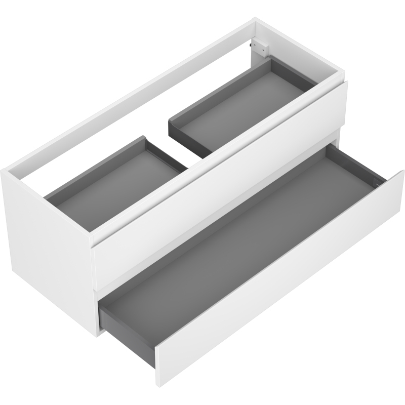 Špecifikácia produktu: Šírka: 120 cm Výška: 47 cm Hĺbka: 46 cm Farba korpusu: Matná biela Materiál korpusu: Lakovaná doska Farba čela: Matná biela Materiál čela: Lakovaná MDF doska Štruktúra čela: Hladká Počet zásuviek: 2 Priestranná zásuvka zásuvky Povrch odolný voči UV žiareniu Kombinovateľný s pracovnou doskou alebo umývadlom Otis, Vela Zmontovaný produkt