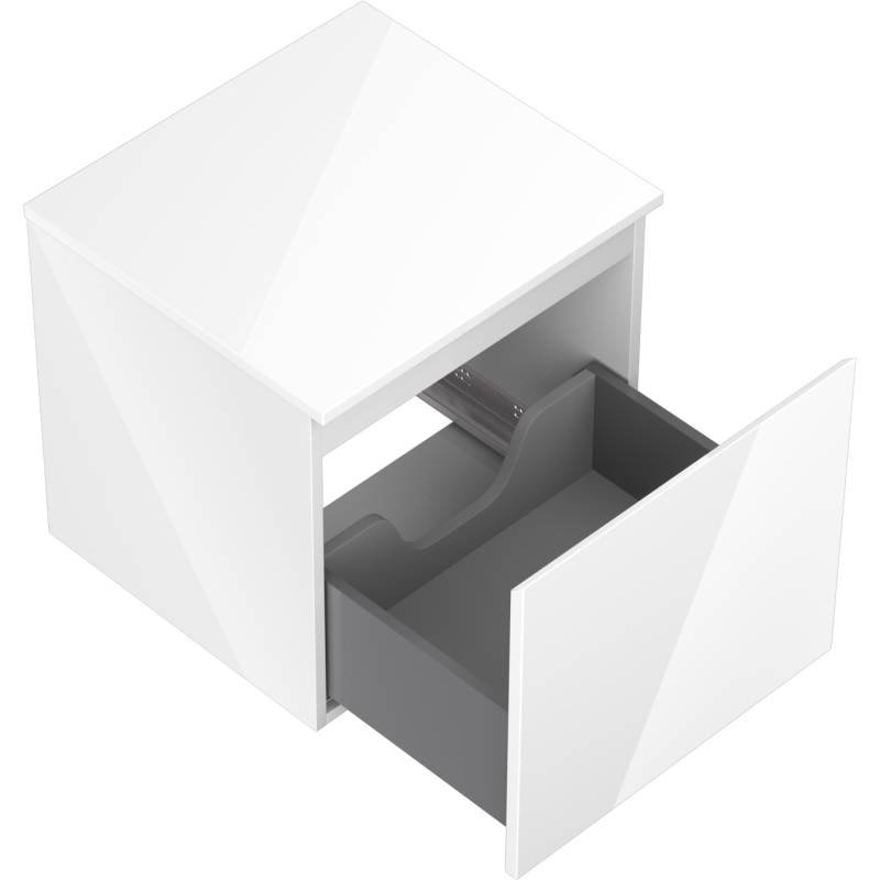 Špecifikácia produktu: Rozmery skrinky: Šírka: 50 cm Výška: 47 cm Hĺbka: 46 cm Farba korpusu: Lesklá biela Materiál korpusu: Lakovaná doska Farba čela: Lesklá biela Materiál čela: Lakovaná MDF doska Štruktúra čela: Hladká Počet zásuviek: 1 výsuv pre ľahký prístup k obsahu zásuvky Povrch odolný voči UV žiareniu Rozmery pracovnej dosky: Šírka: 50,6 cm Hĺbka: 46,5 cm Hrúbka: 1,8 cm Farba pracovnej dosky: Lesklá biela Materiál pracovnej dosky: Lakovaná MDF doska Povrch odolný voči UV žiareniu Ideálny ako podstavec