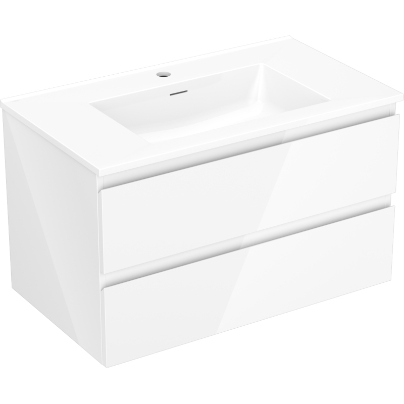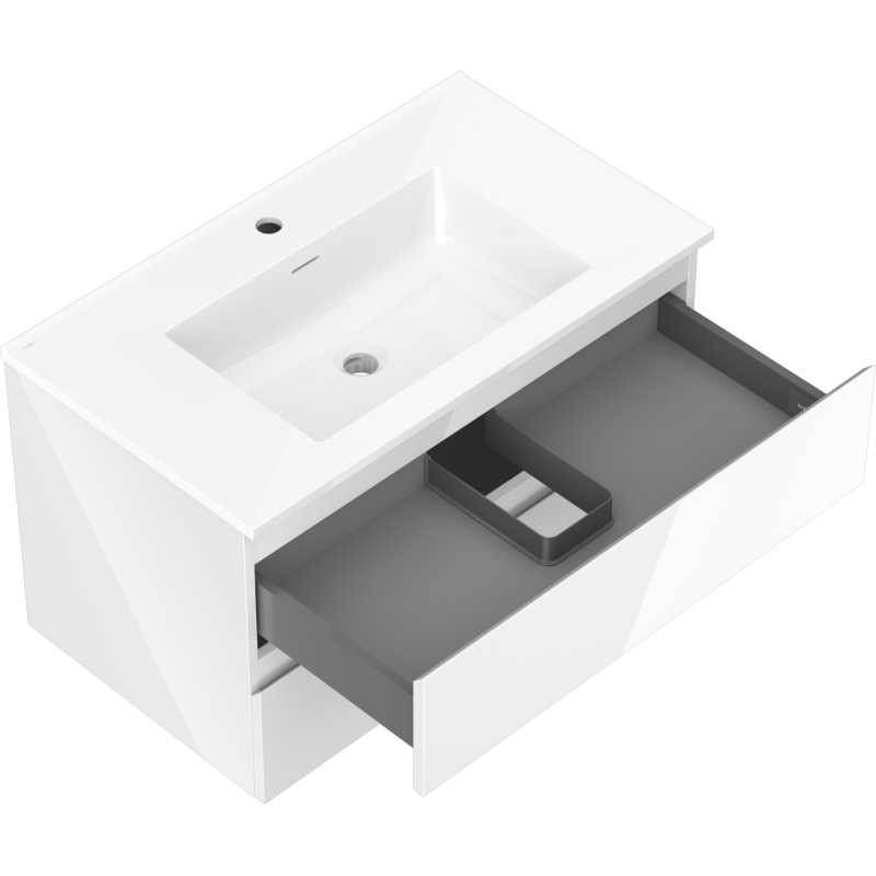 Specyfikacja produktu: Wymiary szafki: Szerokość: 80 cm Głębokość: 46 cm Wysokość: 47 cm Kolor korpus: Biały połysk Materiał korpus: Płyta lakierowana Kolor prednej: Biały połysk Materiał front: Gładka Ilość szuflad: 2 Przestronna szuflada z funkcją cichego domyku Powierzchnia odporná na premienie UV Materiał umywalki: Konglomerat Otwór przelewowy: Tak Otwór na batérie: Tak Produkt zmontowany