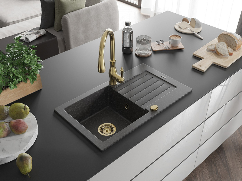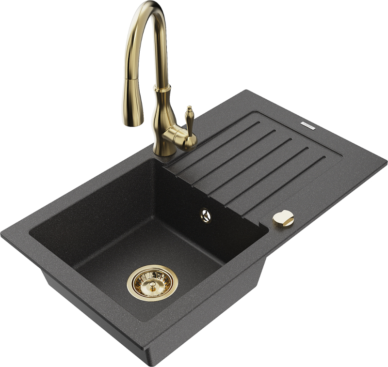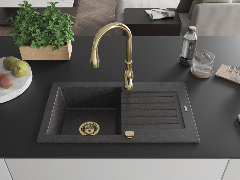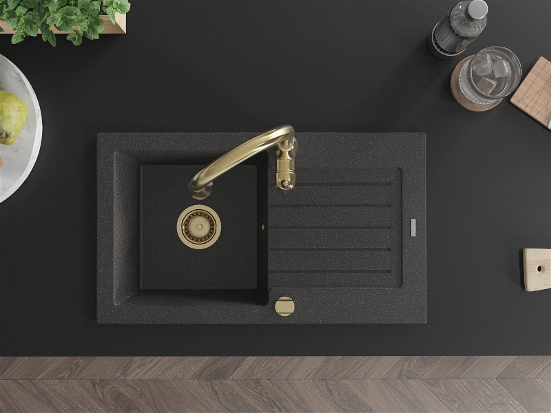 Mexen Pablo 1-miskový granitový drez s odkvapkávačom a kuchynskou batériou Savita, škvrnitá čierna - 6510-76-672601-50