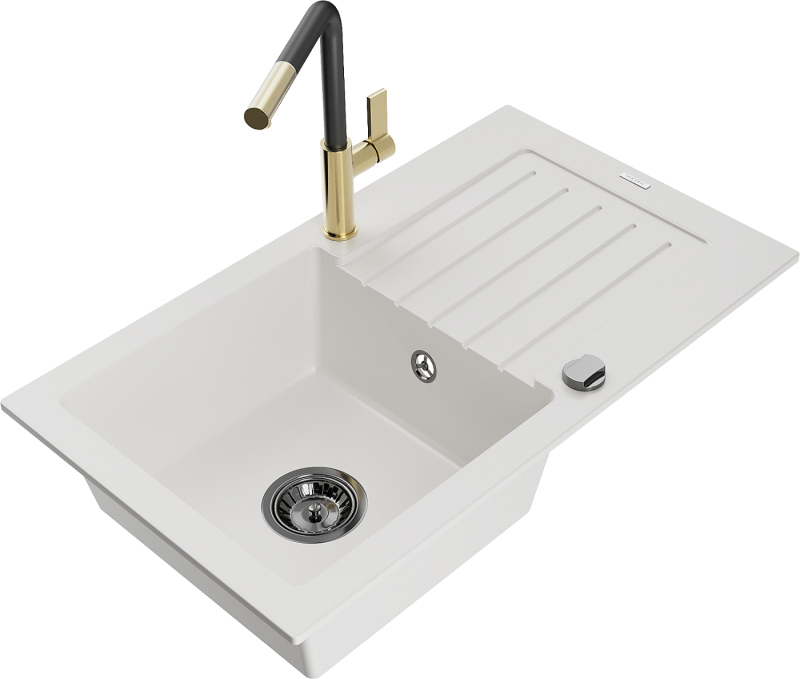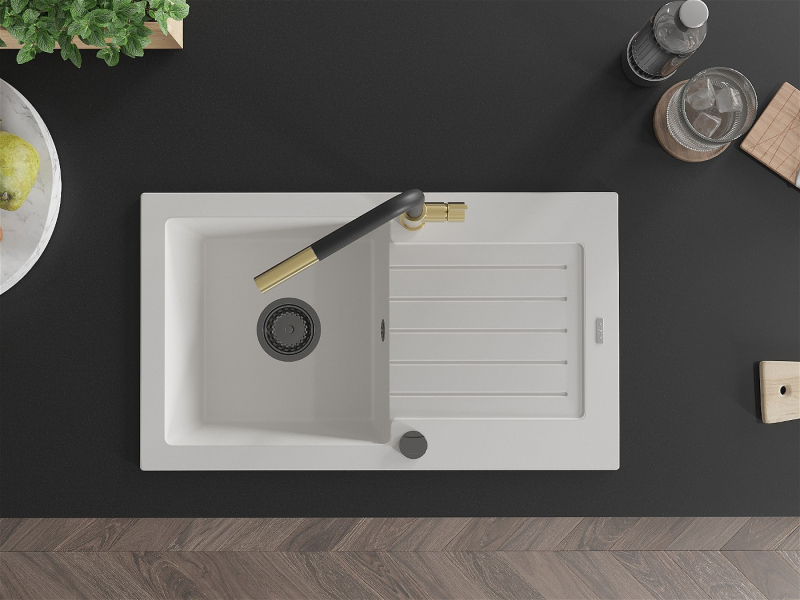 Mexen Pablo 1miskový granitový drez s odkvapkávačom a kuchynskou batériou Flora, biela - 6510-20-670401-57-B