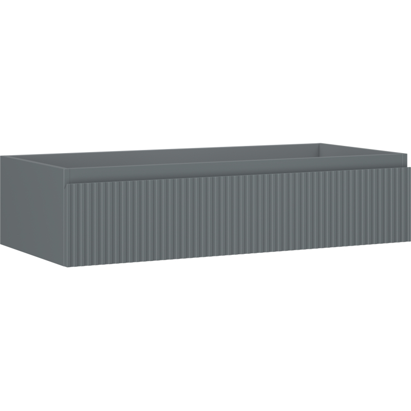 Špecifikácia produktu: Šírka: 100 cm Výška: 23,5 cm Hĺbka: 46 cm Farba korpusu: Matný grafit Materiál korpusu: Lakovaná doska Farba čela: Matný grafit Materiál čela: Lakovaná MDF doska Štruktúra čela: Drážkovaná Počet zásuviek: 1 Priestranná zásuvka prístup k obsahu zásuvky Povrch odolný voči UV žiareniu Kombinovateľný s pracovnou doskou alebo umývadlom Otis, Vela Zmontovaný produkt