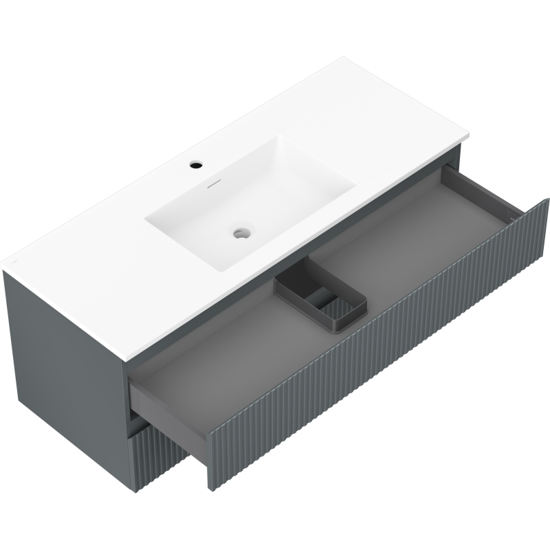 Specyfikacja produktu: Wymiary szafki: Szerokość: 120 cm Głębokość: 46 cm Wysokość: 47 cm Kolor korpus: Grafit mat Materiał korpus: Płyta lakierowana Kolor front: Grafit mat Materiał front: Płyta MDF lakierow szuflad: 2 Przestronna szuflada z funkcją cichego domyku Powierzchnia odporna na premienie UV Wymiary umywalki: Szerokość: 121 cm Głębokość: 46,5 cm Wysokość: 16,5 cm Kolor Konglomerat Otwór przelewowy: Tak Otwór na batérie: Tak Produkt zmontowany