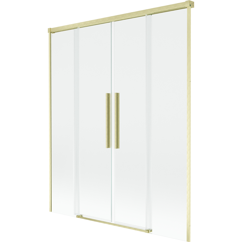 Technické údaje: Šírka: 140 cm Výška: 150 cm Typ: Dvojkrídlové Montáž: Univerzálny Typ: Pohyblivé/Posuvné Typ skla: Tvrdené Farba skla: Priehľadná Hrúbka skla: 8 mm Povrchová úprava: Kartáčované zlato otvorov Možnosť naklonenia dverí na čistenie siete Magnetický prúžok a elastomérové tesnenie, ktoré odvádzajú vodu Dva montážne systémy: - s profilom, ktorý umožňuje vyrovnanie nerovností steny - bez profilu v prípade dokonale rovných stien
