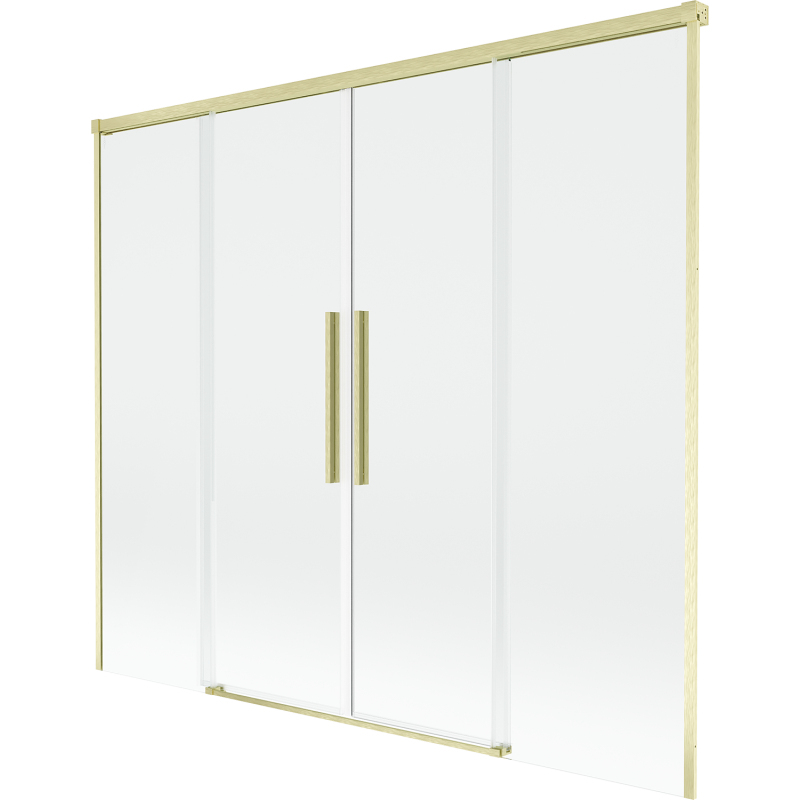 Technické údaje: Šírka: 190 cm Výška: 150 cm Typ: Dvojkrídlové Montáž: Univerzálny Typ: Pohyblivé/Posuvné Typ skla: Tvrdené Farba skla: Priehľadná Hrúbka skla: 8 mm Povrchová úprava: Kartáčované zlato otvorov Možnosť naklonenia dverí na čistenie siete Magnetický prúžok a elastomérové tesnenie, ktoré odvádzajú vodu Dva montážne systémy: - s profilom, ktorý umožňuje vyrovnanie nerovností steny - bez profilu v prípade dokonale rovných stien