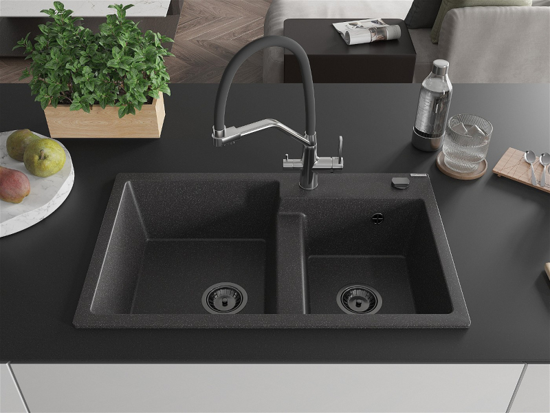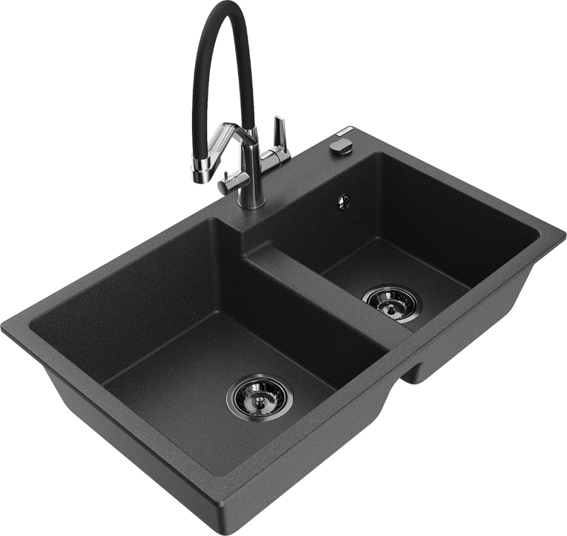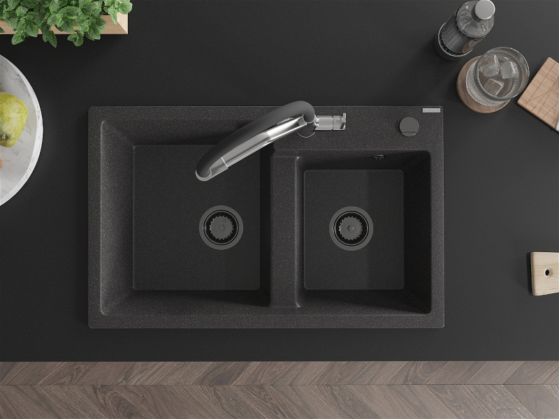 Mexen Tomas 2miskový granit drez s kuchynskou batériou Duo, čierna 6516-76-671701-07-B